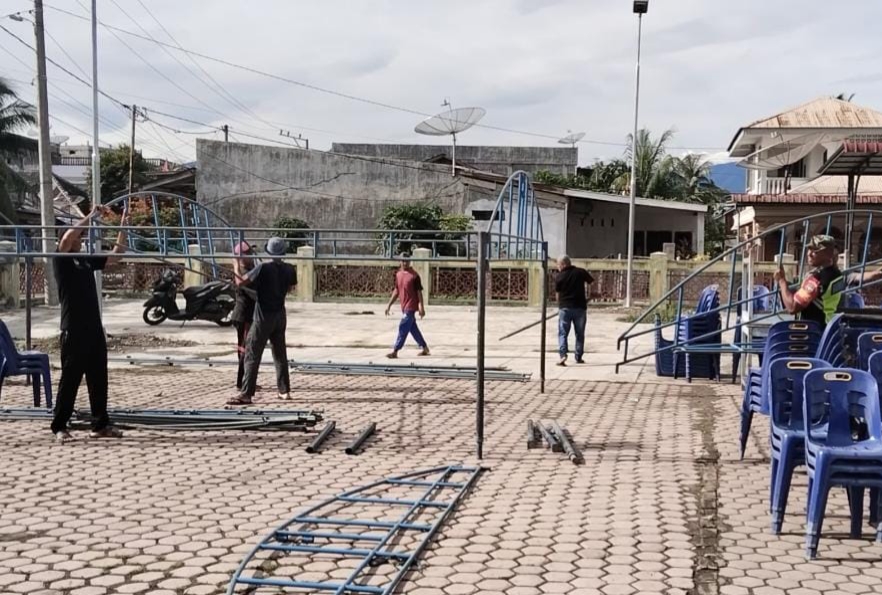 Bireuen — Babinsa Koramil 02/Samalanga, Sertu Teguh Widodo, melaksanakan gotong royong bersama masyarakat dalam rangka pemasangan tenda untuk memperingati Maulid Nabi Muhammad SAW di Desa Gampong Baro, Kecamatan Samalanga, Kabupaten Bireuen. Minggu (28/09/2025).