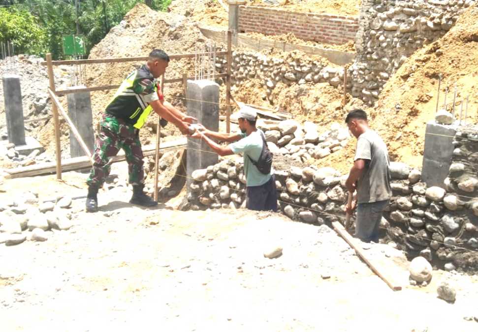 MabesNews.tv-Bireuen, Babinsa Koramil 05/Juli, Serda Sahdan, turun langsung membantu masyarakat di Desa Abuek Budi, Kecamatan Juli, Kabupaten Bireuen, dalam pembangunan turap atau dinding penahan tanah. Jumat (12/09/2025).