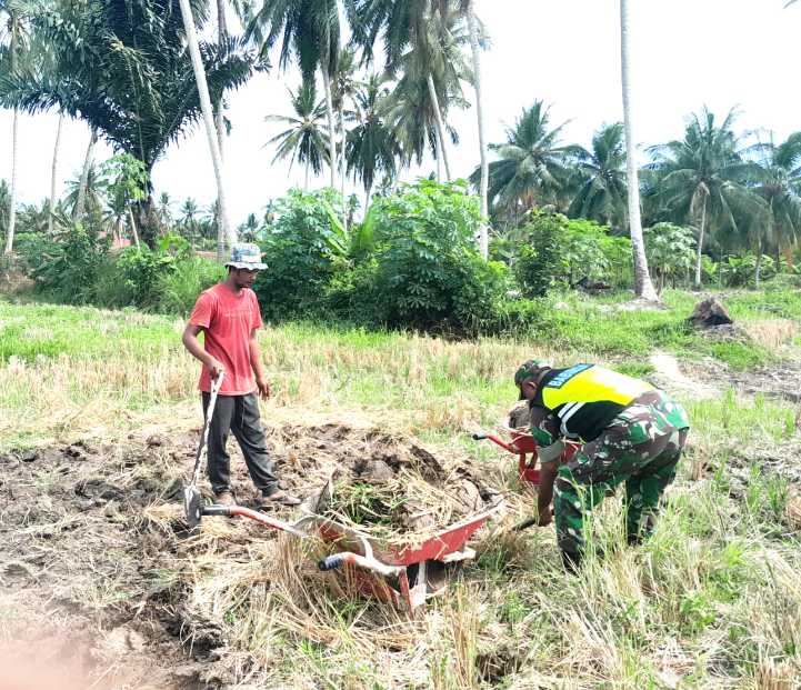 MabesNews.tv : Bireuen – Serka Adnan, Babinsa Koramil 07/Jangka Kodim 0111/Bireuen, bersama masyarakat melaksanakan kegiatan gotong royong memindahkan tanah sisa galian pembuatan saluran cacing untuk pengaliran air sawah di Desa Bugak Krueng Mate, Kecamatan Jangka, Kabupaten Bireuen. Rabu (03/09/2025).