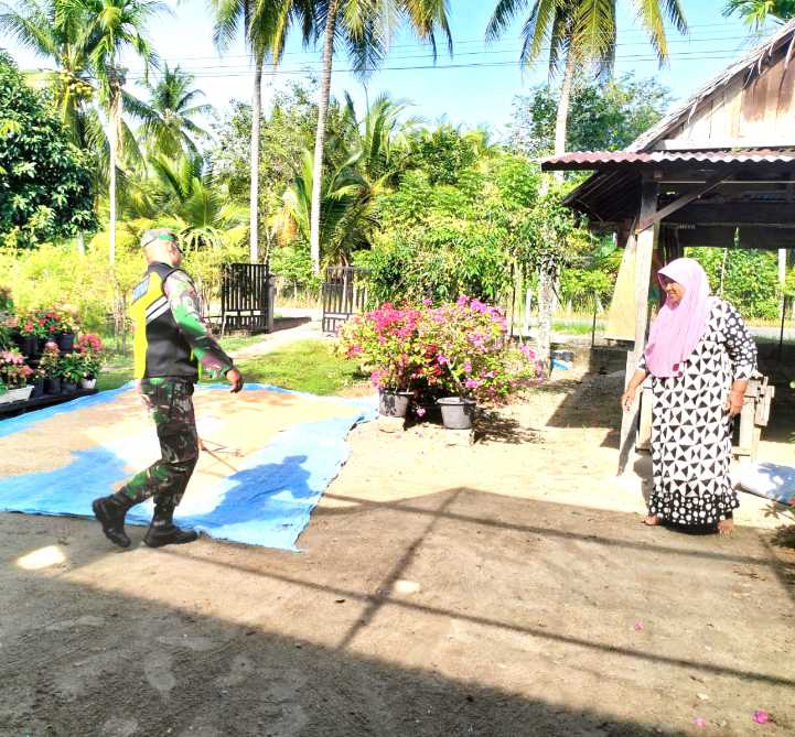 Babinsa Posramil Simpang Mamplam Bantu Warga Jemur Padi di Desa Tambu Barat.