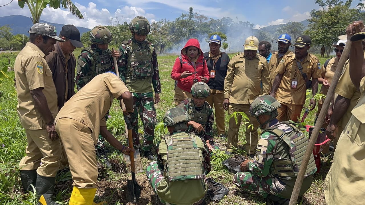 Mabesnews.Tv,-Memberamo Tengah, –“Bersatu dengan alam” berarti mengakui bahwa manusia adalah bagian integral dari ekosistem, bukan terpisah darinya, dan bahwa interaksi dengan alam membawa manfaat positif. Satgas Yonif 521/DY, kepeduliannya terhadap lingkungan dan masyarakat dengan melaksanakan aksi tanam pohon bersama Dinas Pertanian setempat di Distrik Kobakma, Kabupaten Mamberamo Tengah. (19/9/2025).