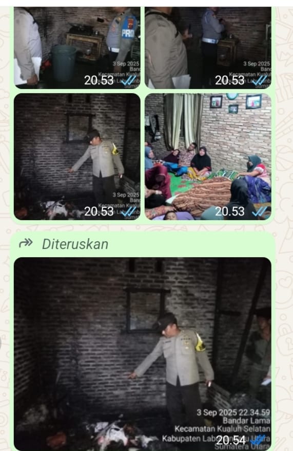 MabesNews.Tv, Labuhanbatu Utara( Labura ) Sumut. – Personel Polsek Kualuh Hulu Polres Labuhanbatu melakukan pengecekan Tempat Kejadian Perkara (TKP) musibah kebakaran yang menghanguskan satu unit rumah permanen di Dusun V, Desa Bandar Lama, Kecamatan Kualuh Selatan, Kabupaten Labuhanbatu Utara, Rabu (3/9/2025) malam.