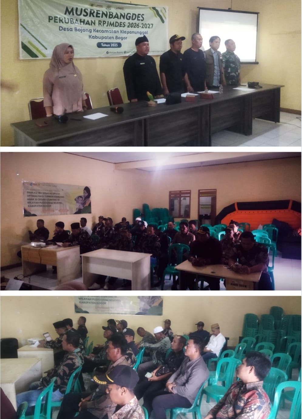Musrenbang desa perubahan RPJM (Rencana Pembangunan Jangka Menengah Desa) adalah Musyawarah Desa (Musdes) atau Musyawarah Perencanaan Pembangunan Desa (Musrenbangdes) yang diadakan untuk membahas dan menyepakati perubahan Rencana Pembangunan Jangka Menengah Desa Bojong (RPJM Desa) yang sudah ada. Kegiatan ini bertujuan untuk menyesuaikan pembangunan desa dengan perubahan regulasi, seperti perubahan UU Desa, kebutuhan mendesak, dan kondisi desa yang dinamis, serta melibatkan masyarakat untuk menyusun rencana pembangunan yang lebih efektif dan relevan.
