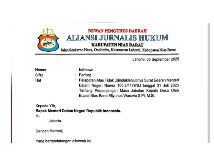Namun, sayangnya, hingga saat ini, Bupati Nias Barat Eliyunus Waruwu, S. Pt, M. Si belum menunjukkan keseriusan untuk mengikuti Surat Edaran Menteri Dalam Negeri Nomor 100. 3/4179/SJ tanggal 31 Juli 2025 mengenai Perpanjangan Masa Jabatan Kepala Desa dengan alasan yang tidak jelas. Atas ketidak patuhannya tersebut, Dewan Pengurus (DPD) Aliansi Jurnalis Hukum (AJH) Kabupaten Nias Barat melaporkan Bupati Nias Barat kepada Menteri Dalam Negeri RI di Jakarta, melalui surat yang dikirim pada 05 September 2025.