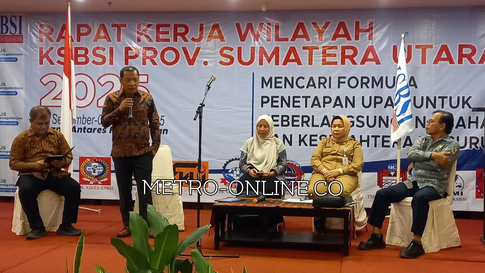 Kadisnaker Sumut Yuliani Siregar (kiri) dan Korwil KSBSI Sumut Ramlan Hutabarat saat memberikan kata sambutan.