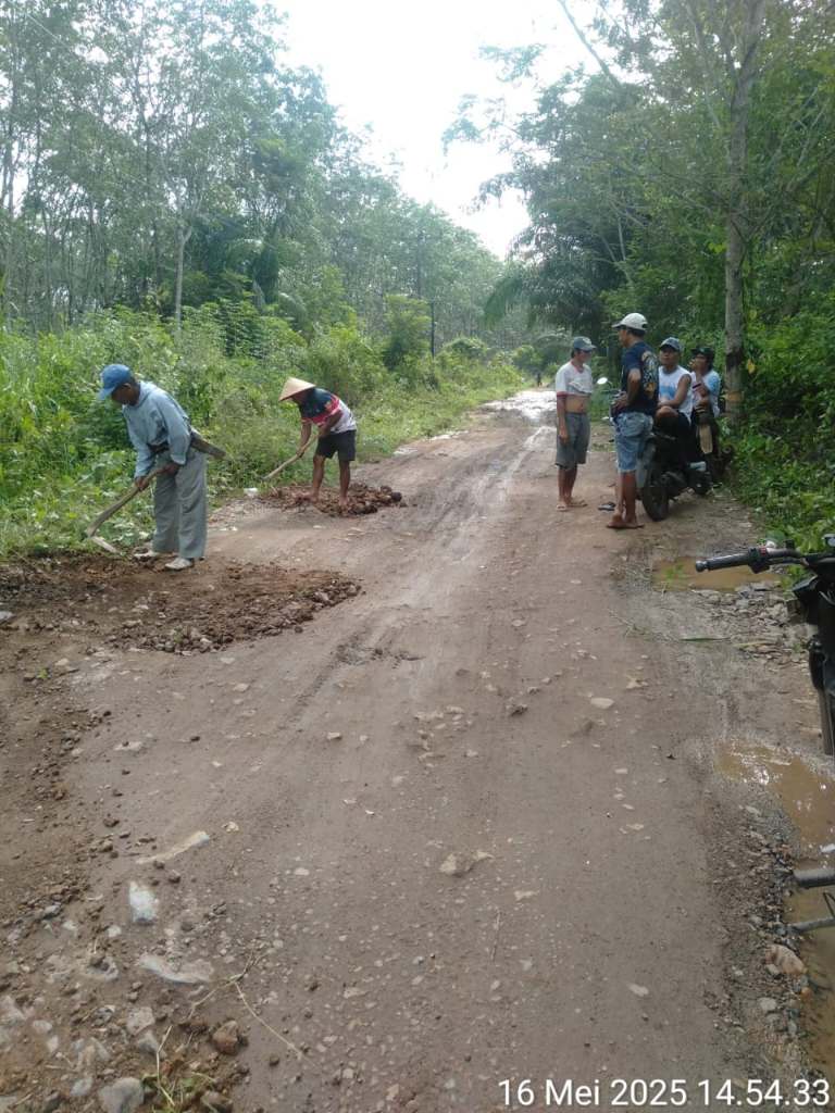 Kepala kampung tanjung rejo (I Ketut Same) bersama warga melakukan kegiatan gotong royong membersihkan jalan poros kabupaten dari dusun 1- dusun 6 di kampung tanjung rejo,kecamatan negeri agung,kabupaten way kanan. Jum’at/16/05/2025.