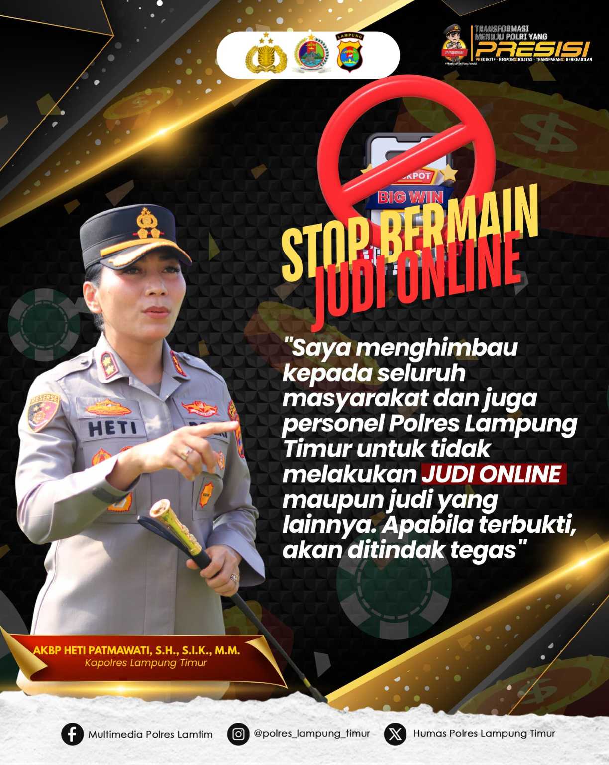 Kapolres Lampung Timur, AKBP Heti Patmawati, mengimbau seluruh masyarakat serta personel Polres Lampung Timur untuk tidak terlibat dalam praktik judi online maupun bentuk perjudian lainnya. Himbauan ini disampaikan sebagai bentuk komitmen Polres Lampung Timur dalam memberantas segala bentuk penyakit masyarakat yang dapat merusak moral dan kehidupan sosial.