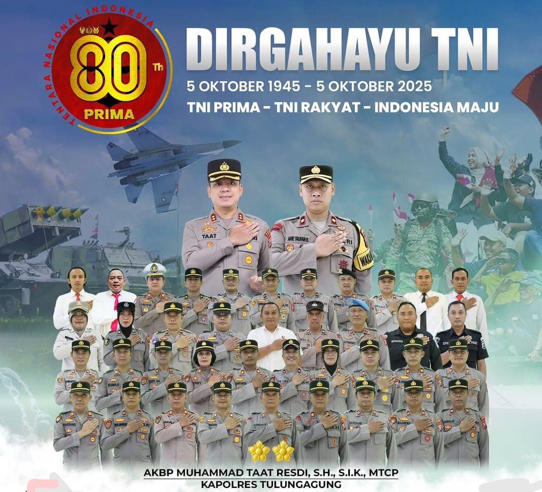 MABESNEWS.TV, TULUNGAGUNG – Dalam suasana penuh semangat kebangsaan, Kapolres Tulungagung Polda Jawa Timur, Ajun Komisaris Besar Polisi (AKBP) Muhammad Taat Resdi S,H., S,I,K., MTCP, beserta Staf dan Bhayangkari menyampaikan ucapan selamat Hari Ulang Tahun(HUT) Tentara Nasional Indonesia (TNI) ke-80 yang diperingati 5 Oktober 1945 – 5 Oktober 2025,