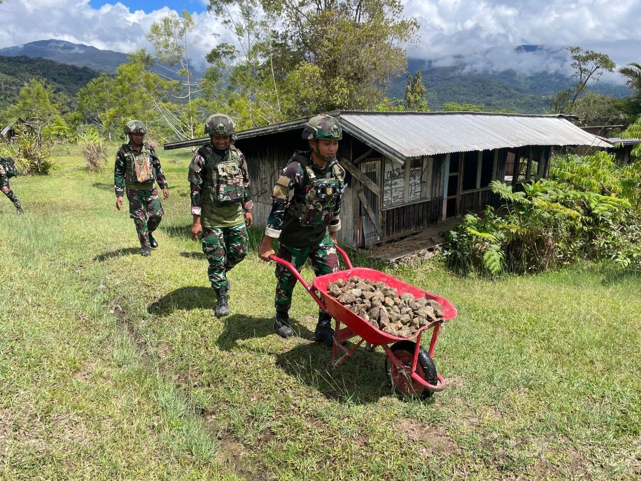 Masyarakat dan TNI melakukan karya bhakti untuk pembangunan infrastruktur seperti jalan, kebersihan lingkungan dan Timbun Lintasan Pesawat dengan Batu.