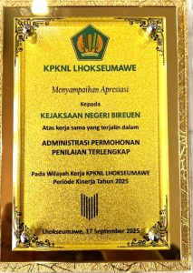 Penghargaan ini diberikan oleh KPKNL karena Kejaksaan Negeri Bireuen atas komitmen bersama terkait Optimalisasi Pengelolaan Barang Rampasan Negara Pada Kejari Bireuen
