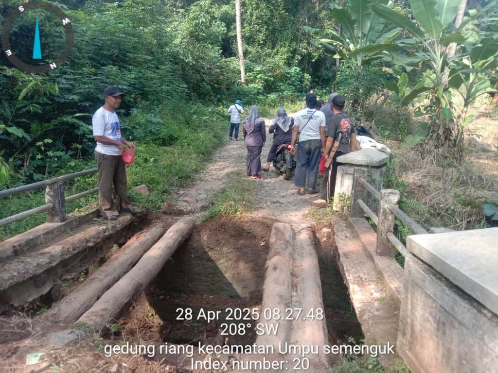 Kepala kampung Gedung riang kecamatan Umpu semenguk kabupaten Waykanan ajak aparatur kampung untuk bergotong royong memperbaiki jembatan penghubung di dusun 5, jalan penghubung di kampung Sukarame, telah rusak parah, sehingga memperhambat kendaraan yang melewati jalan tersebut.