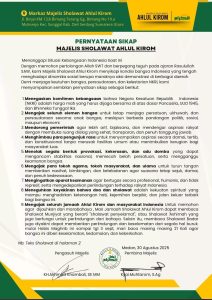 Dalam pernyataannya, Majelis Sholawat Ahlul Kirom menyampaikan sembilan butir sikap sebagai bentuk keprihatinan sekaligus doa bagi Indonesia.