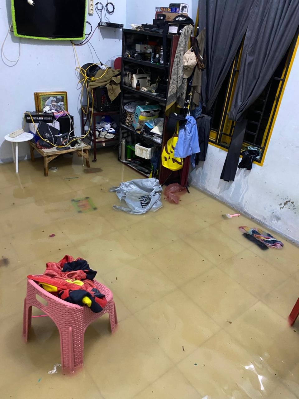 Banjir tersebut diduga terjadi akibat tersumbatnya saluran pembuangan menuju parit besar. Kerugian ditaksir mencapai Rp8 juta.