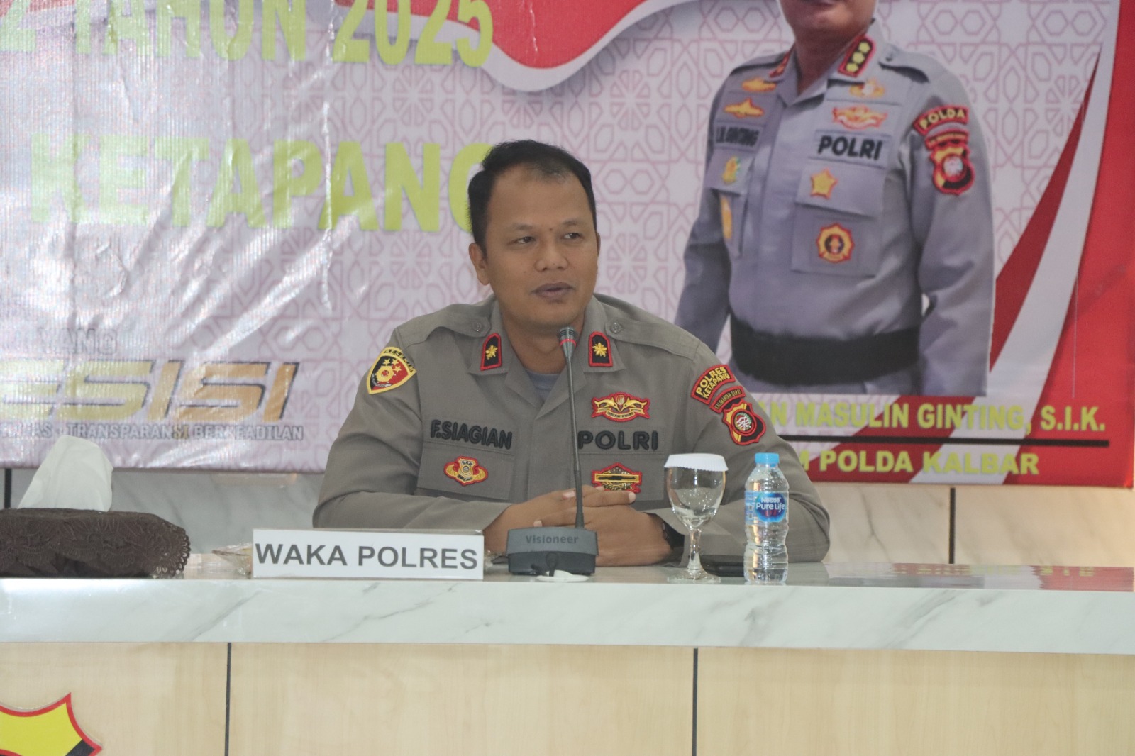 Kapolres Ketapang, AKBP Muhammad Harris, S.H., S.I.K., M.I.K., melalui Wakapolres Ketapang Kompol Frits Orlando Siagian, S.I.K., M.H., yang menyertai Tim Bidpropam Polda Kalbar dalam kegiatan ini menyambut baik kegiatan pembinaan etika profesi pada pagi hari ini. Menurutnya, pembinaan dari Bipropam sangat penting untuk mengingatkan kembali seluruh anggota akan tugas dan tanggung jawabnya. ” Kami berkomitmen untuk terus meningkatkan pelayanan kepada masyarakat. Pembinaan ini adalah langkah proaktif untuk mencegah terjadinya pelanggaran yang dapat merusak kepercayaan publik,” kata Kompol Frits Orlando Siagian. Melalui kegiatan ini, diharapkan seluruh anggota Polres Ketapang dapat memahami dan mengimplementasikan Kode Etik Profesi Polri dengan baik, sehingga tercipta Polri yang Presisi (Prediktif, Responsibilitas, Transparansi Berkeadilan) dan semakin dekat bersama masyarakat.