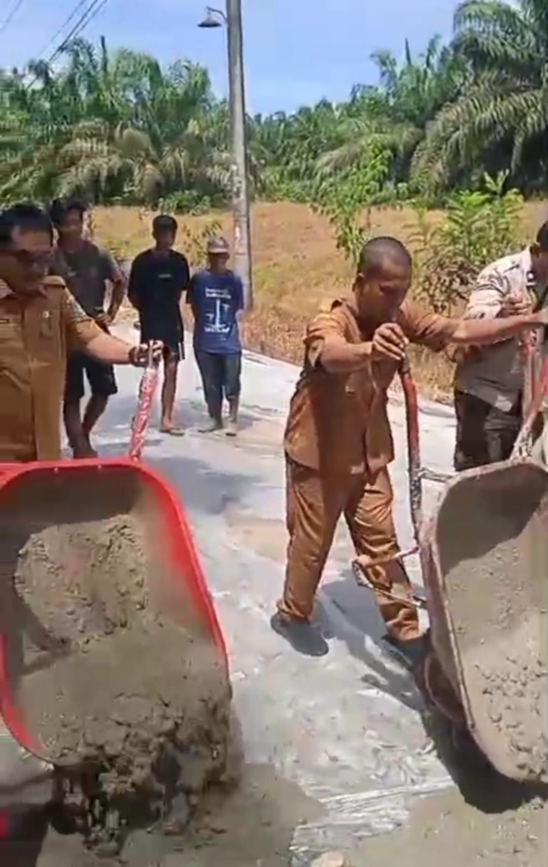 Penjabat (Pj) Kepala Desa Heri Kusmawan, SPd., MM, bersama Bhabinkamtibmas dan perwakilan kecamatan, Jamil Amri, SH, memberikan arahan dan semangat kepada masyarakat setempat untuk menjaga kualitas pembangunan. Cuaca yang mendukung memungkinkan proses pembangunan berjalan lancar.