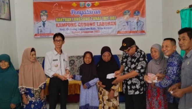 Pemerintah kampung gunung labuhan kecamatan gunung labuhan kabupaten way kanan lampung,kembali salurkan Bantuan Langsung Tunai Dana Desa (BLT -DD) kepada 10 warga KPM sesuai hasil dari muskamsus Triwulan Pertama,penyaluran BLT-DD di laksanakan di balai kampung setempat,kamis 27/03/2025