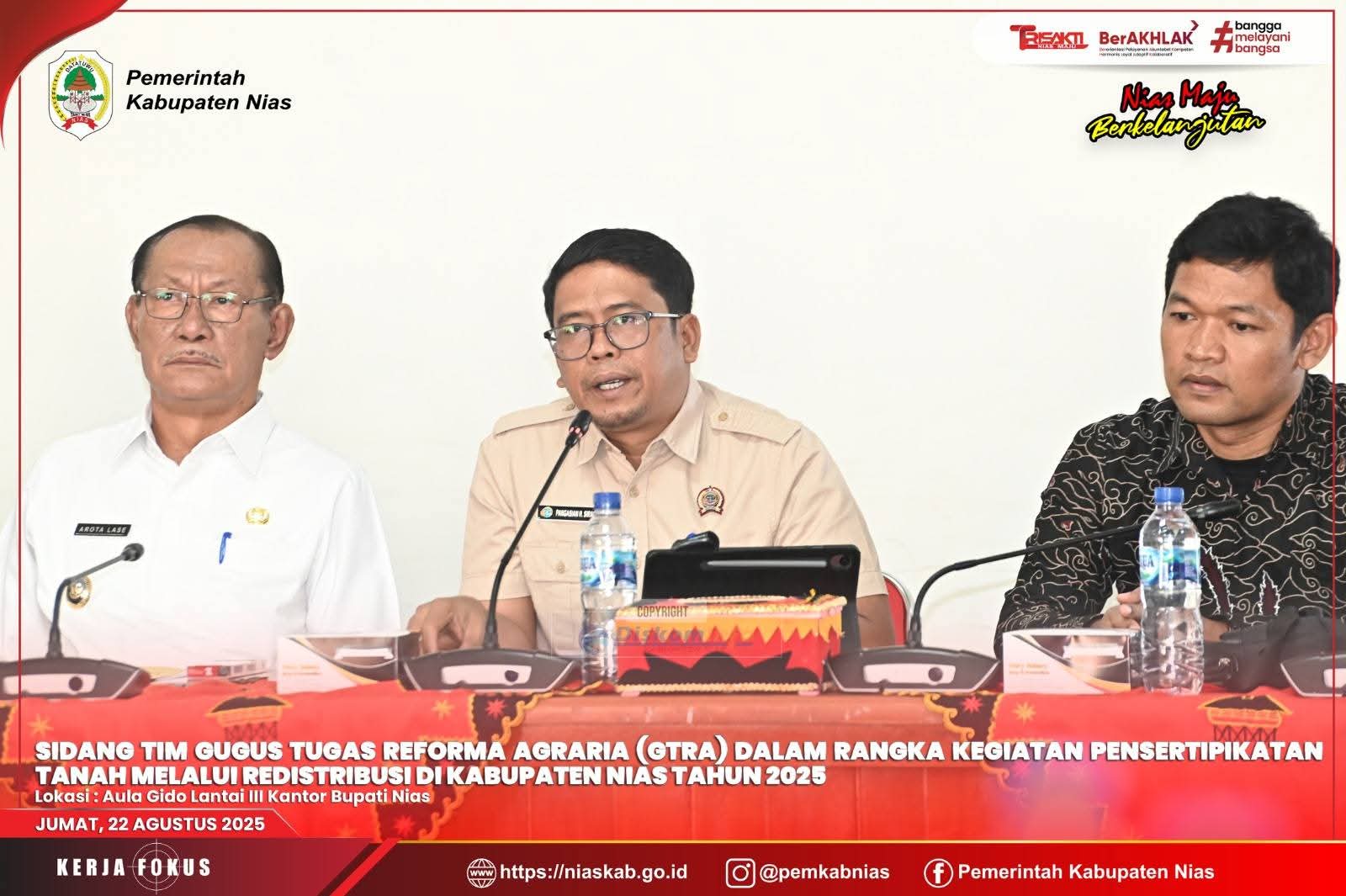 Kepala Kantor Pertanahan Kabupaten Nias Pangasian Hatigoran Sirait, S.Kom., M.Si melaporkan bahwa Tujuan sidang GTRA adalah dalam rangka penetapan objek subjek redistribusi tanah yaitu memastikan letak batas, luas penggunaan, penguasaan dan kondisi tanah clean and clear dan memberikan rekomendasi dalam penetapan objek dan subjek redistribusi tanah. Tim Gugus Tugas Reforma Agraria Kabupaten Nias beranggotakan 38 orang (Ketua, Sekretaris, Ketua Pelaksana Harian, Camat, Kepala Desa, Staf Kantor Pertanahan dan Anggota).
