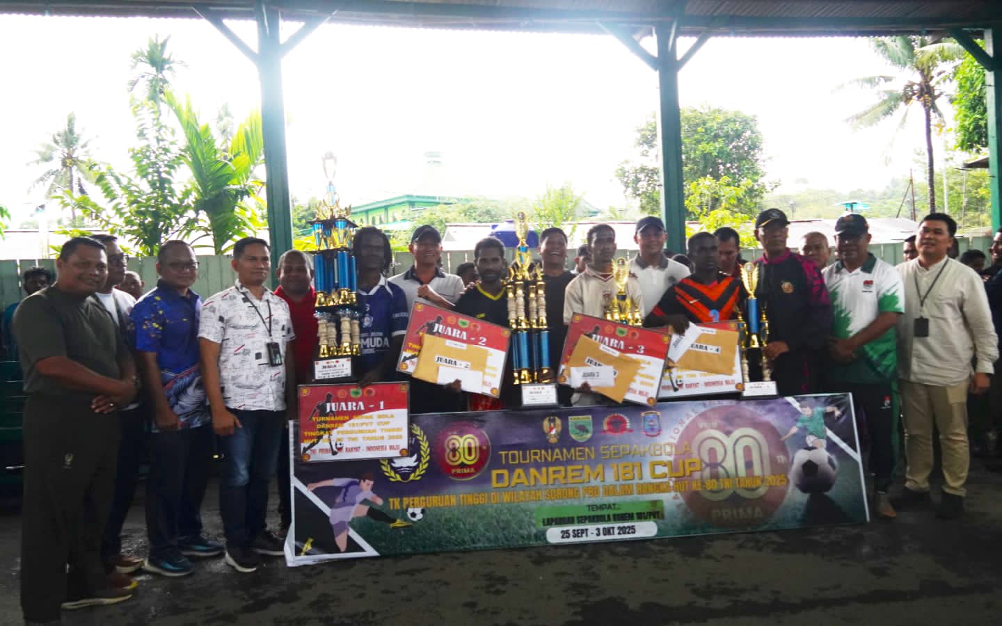 MabesNews.TV. Sorong, Papua Barat Daya – Turnamen Sepak Bola Danrem 181 Cup tingkat perguruan tinggi resmi ditutup dengan meriah pada Jumat (3/10/2025) di Lapangan Sepak Bola Markas Korem 181/Praja Vira Tama (PVT). Acara penutupan dihadiri sekitar 390 peserta dan tamu undangan, menandai berakhirnya kompetisi yang sukses menjaring bibit-bibit muda berbakat dari Papua Barat Daya.