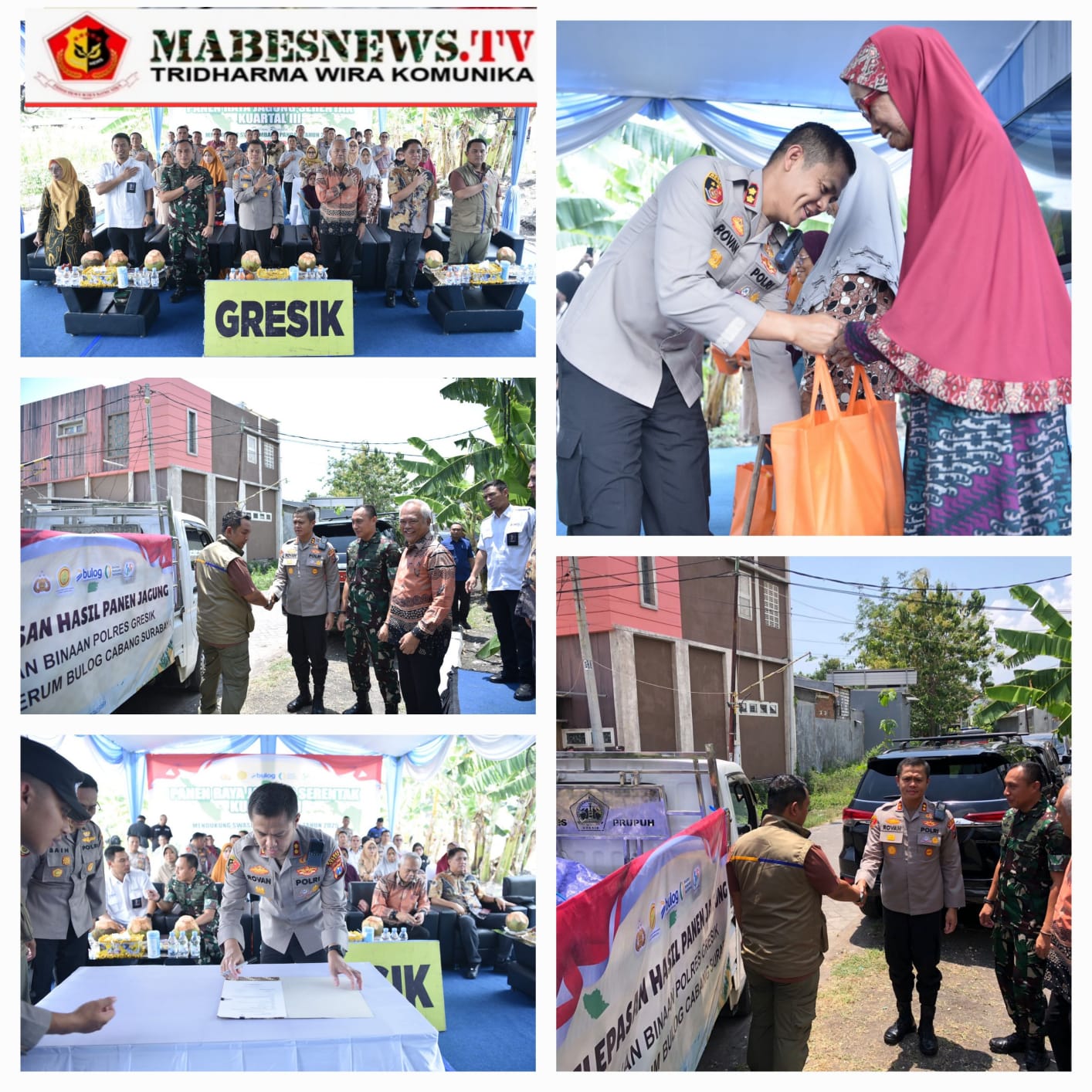 Rangkaian acara diawali dengan penyerahan bantuan sembako kepada warga, dilanjutkan dengan penandatanganan berita acara penyerahan hasil panen dari Polres Gresik kepada Bulog. Armada pengangkut hasil panen kemudian diberangkatkan secara simbolis, disaksikan seluruh undangan. Selain itu, Kapolres Gresik dan rombongan juga mengikuti Zoom Meeting Panen Jagung Serentak bersama Mabes Polri.