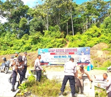 Polres Pidie Pasang Spanduk Himbauan Stop Illegal Mining dan Illegal Logging di Geumpang