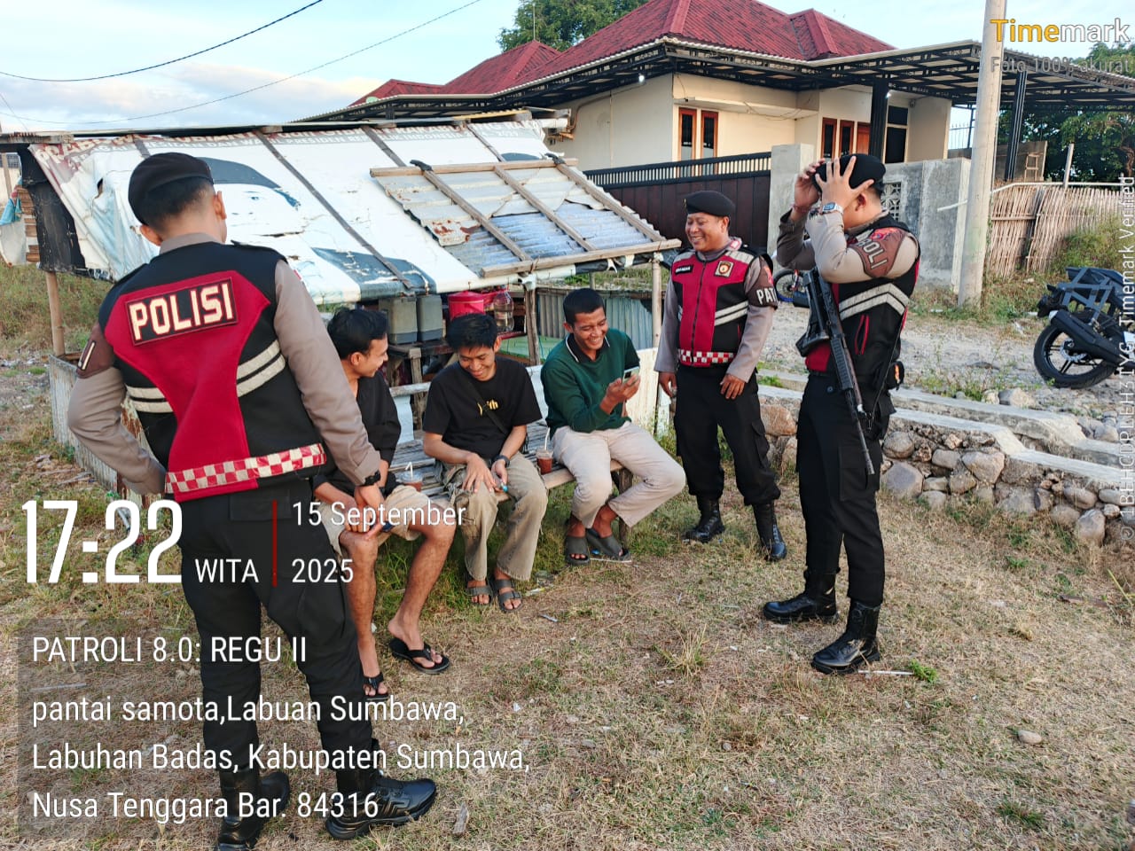 Mabesnews.Tv, Sumbawa Besar, NTB – Satuan Samapta Polres Sumbawa terus mengintensifkan Kegiatan Rutin yang Ditingkatkan (KRYD) untuk menjaga keamanan dan ketertiban masyarakat (kamtibmas). Pada Senin, 15 September 2025, pukul 17.25 WITA, tim patroli yang dipimpin oleh Bripka Iskandar Sahdi bersama empat personel lainnya, yaitu Bripda Izzam Jaelani, Bripda Marwazi Thoriq, Bripda Putu Valintino Rossy, dan Bripda Kemas Manulang, melaksanakan patroli di wilayah Pantai Samota, Kecamatan Labuan Badas, Kabupaten Sumbawa.
