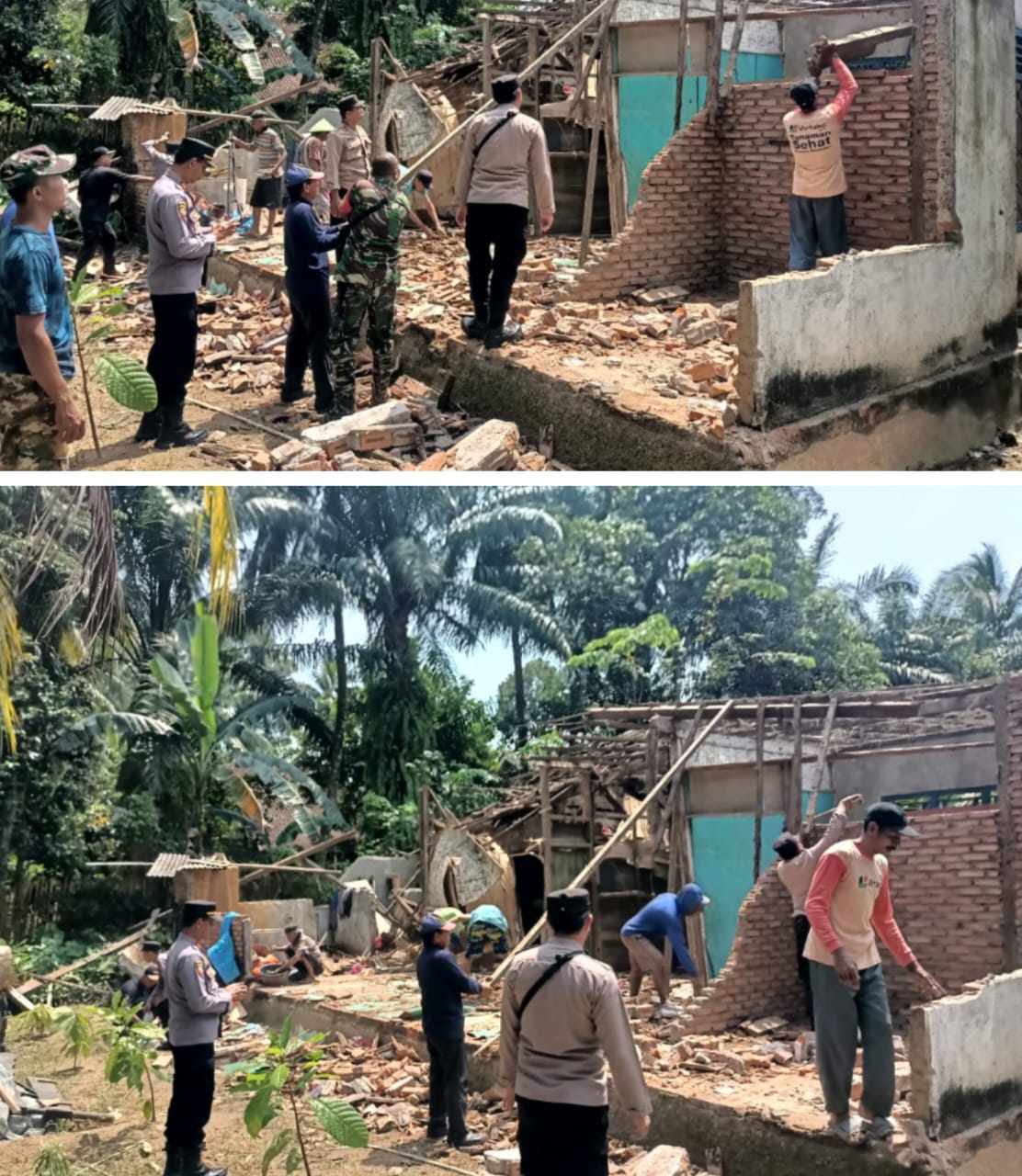 Polres Tanggamus Bersama Warga Gotong Royong Bersihkan Rumah Terdampak Gempa