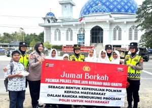 PIDIE JAYA – Dalam rangka meningkatkan kepercayaan masyarakat terhadap Polri dan menghadirkan rasa aman di tengah lingkungan warga, Polwan Polres Pidie Jaya melaksanakan kegiatan Patroli dan Jumat Berkah, pada Jumat (3/10/2025) di wilayah hukum Polres Pidie Jaya.