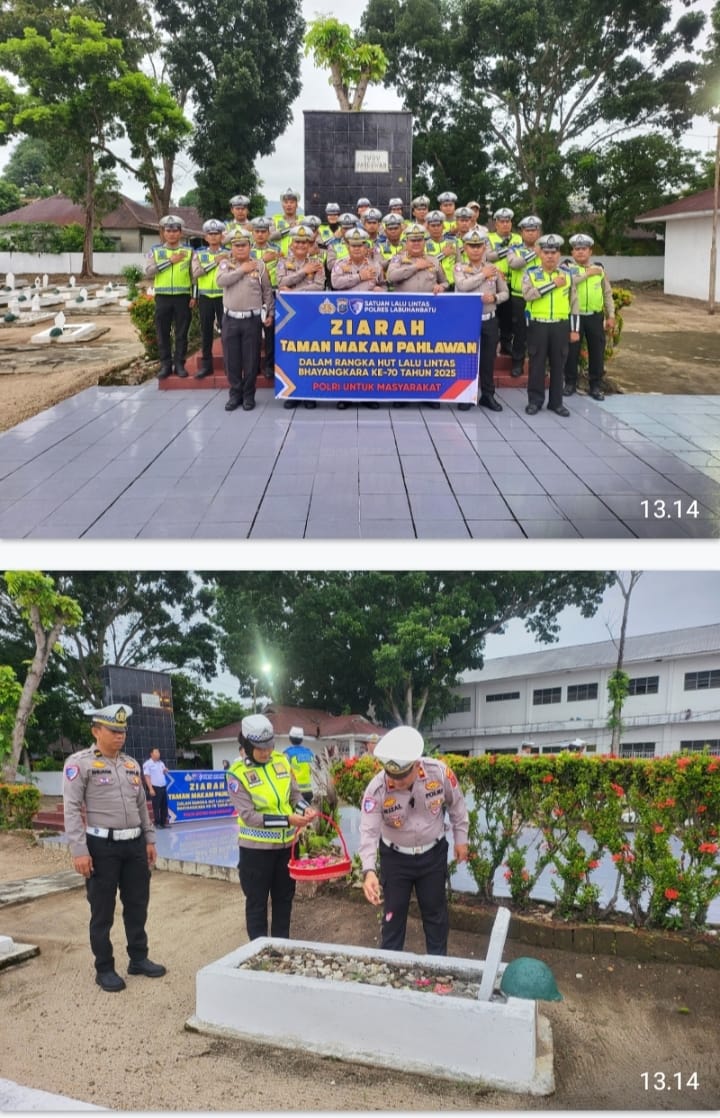 MabesNews.tv, Labuhanbatu ( Sumut ) – Dalam rangka menyambut HUT ke-70 Lalu Lintas Bhayangkara tahun 2025, Satuan Lalu Lintas Polres Labuhanbatu melaksanakan kegiatan ziarah ke Taman Makam Pahlawan (TMP) Kabupaten Labuhanbatu, Jalan Jendral Ahmad Yani, Kecamatan Rantau Utara, Rabu (17/9/2025).