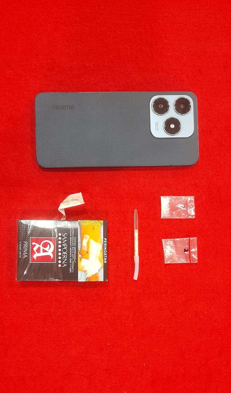 Barang bukti yang diamankan antara lain sabu dengan total berat netto 0,15 gram, satu unit handphone merek Realme warna biru, satu bungkus rokok, satu sendok sabu dari sedotan plastik, dan satu unit sepeda motor Yamaha Gear warna putih bernopol M-4954-XB.