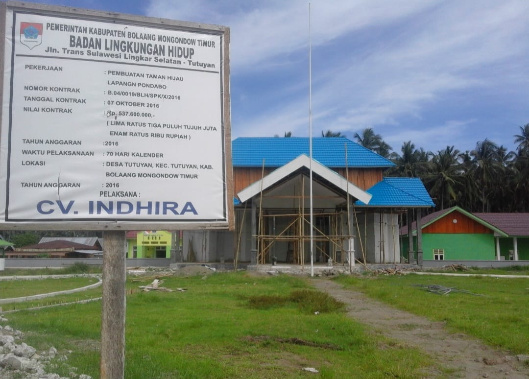 Sekedar di ketahui bahwa, pada pemerintahan sebelumnya Pemda Boltim telah mengalokasikan program pembangunan taman hijau lapangan Pondabo, dan terakhir pada Tahun 2016 Pemda Boltim juga telah mengalokasikan anggaran kembali sebesar Rp.537.600.000 melalui program pembangunan taman hijau lapangan Pondabo yang dikerjakan oleh CV. INDHIRA dengan Nomor Kontrak : B.04/0019/BLH/SPK/X/2016, namun sangat disayangkan pekerjaan taman hijau lapangan Pondabo tersebut tidak dapat diselesaikan oleh pihak pelaksana CV. INDHIRA sehingga Pemda Boltim pada saat itu diduga mengambil sikap tegas lewat pemutusan kontrak kerja sesuai dengan ketentuan yang berlaku. (Pusran Beeg)