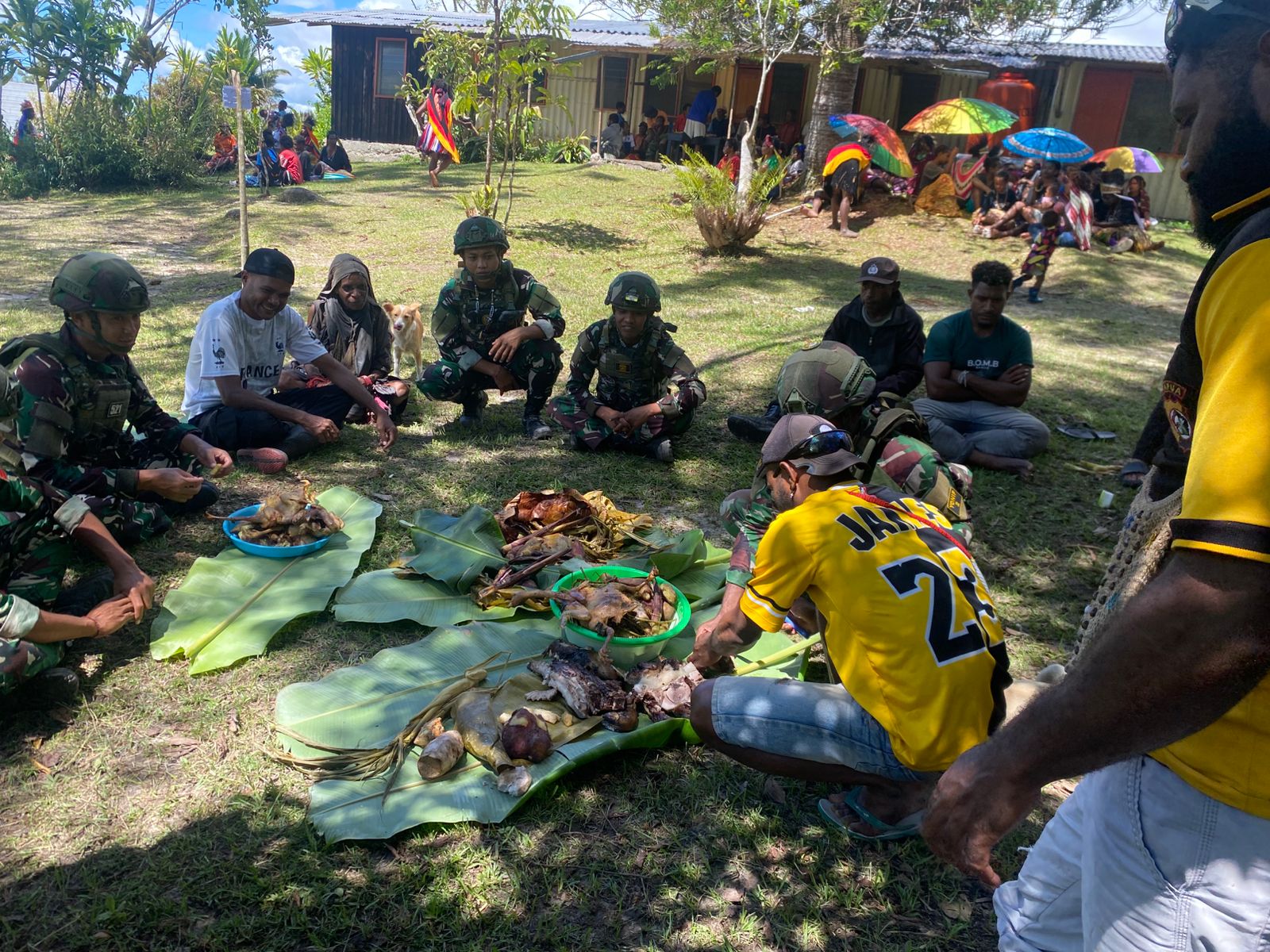 Turut hadir personel Satgas Yonif 521/DY Pos Apalapsili dalam Rangkaian acara ini menambah hangat suasana. Mereka tidak sekadar hadir, tetapi ikut bekerja bersama warga, memindahkan batu panas, menyiapkan makanan, hingga menyantap hasil bakar batu bersama-sama. Momen sederhana ini menghadirkan kedekatan yang tulus antara aparat dan masyarakat, tanpa sekat.
