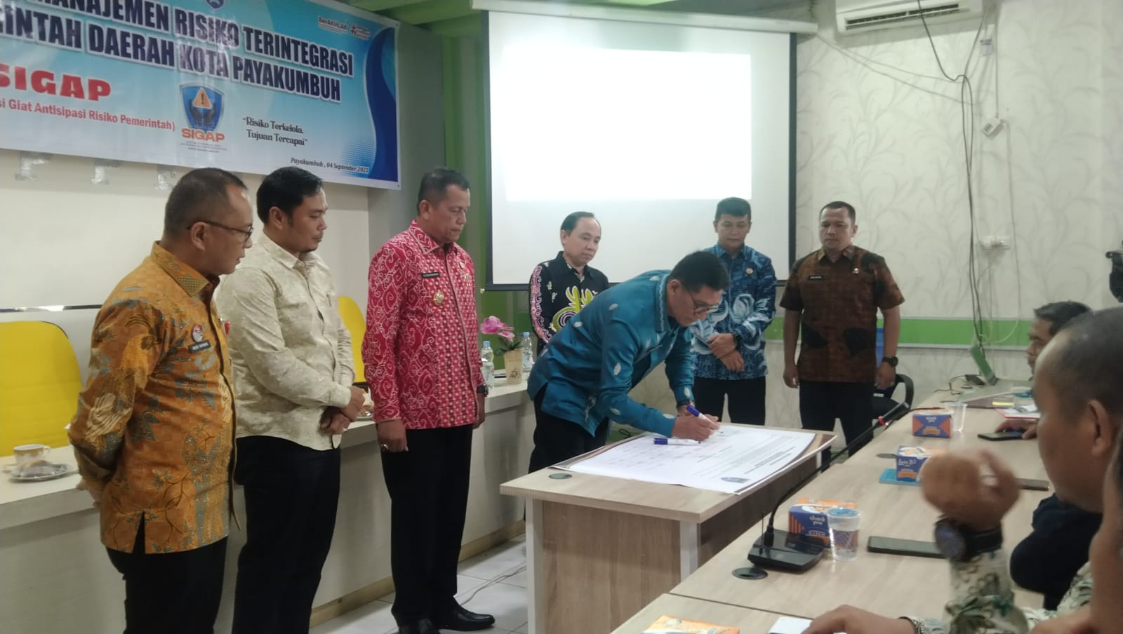 Acara launching dan sosialisasi diakhiri dengan Penandatanganan Komitmen Bersama Pelaksanaan Strategi Penerapan Sistem Manajemen Risiko Terintegrasi oleh 31 Kepala OPD, disaksikan Wakil Wali Kota Payakumbuh, Asisten dan Staf Ahli Pemko Payakumbuh. (Samsul Daeng Pasomba/Aznizenti/Tim)